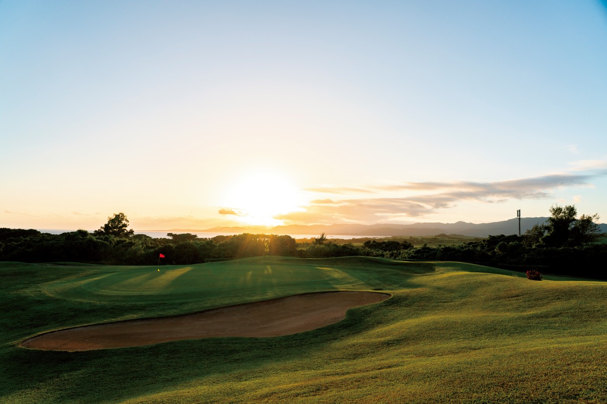 日が西に傾いた夕暮れ時の景観は息をのむ美しさ。遠くに霞む西表島の山並みもリゾートゴルフ気分を高めてくれる。