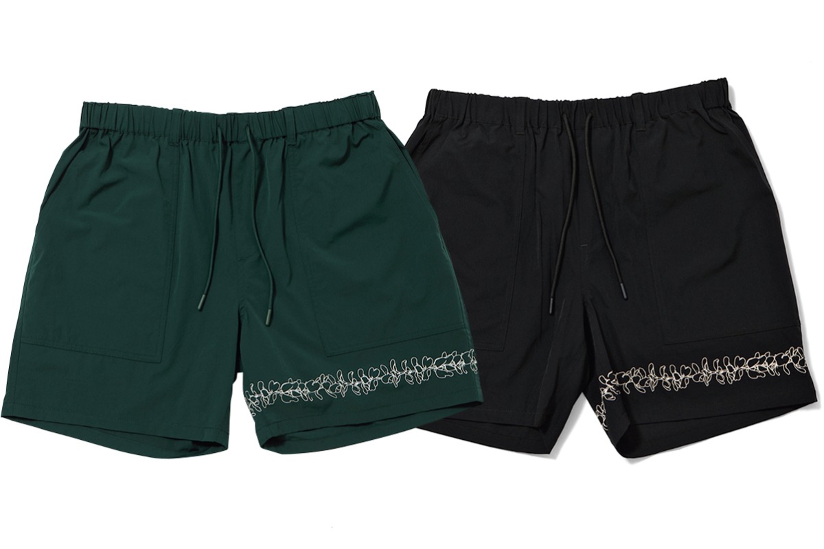 左裾にぐるりと入った柄がSALVAGE PUBLICらしい雰囲気に仕上がり。今までは右バックポケットのみだったが、左後ろにもポケットを加え収納力が増したところも嬉しいポイント。サラっとした肌離れの良いストレッチナイロンでストレスなくプレーを楽しめる。