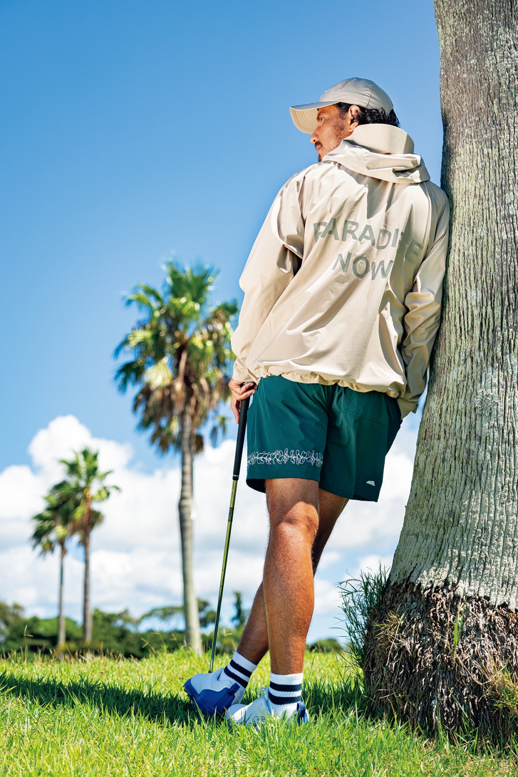 軽量でストレッチの効いた透湿防水、撥水性に優れた2.5レイヤー素材。背面には人気の“PARADISE NOW”のリフレクタープリント。ラウンド中の突然の雨にも安心して対応してくれるフルジップパーカ。比翼仕立ての仕様は雨や風を防げるし、年間を通して重宝するはず。