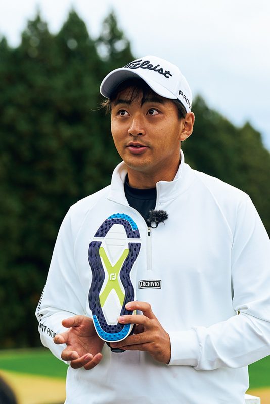 「足首がしっかりはまってくれてフィット感が良いですね。ソールにクッション性と反発があるので、地面をしっかり蹴ってくれる印象を受けました。足が滑ることをまったく気にせずショットに集中できます」