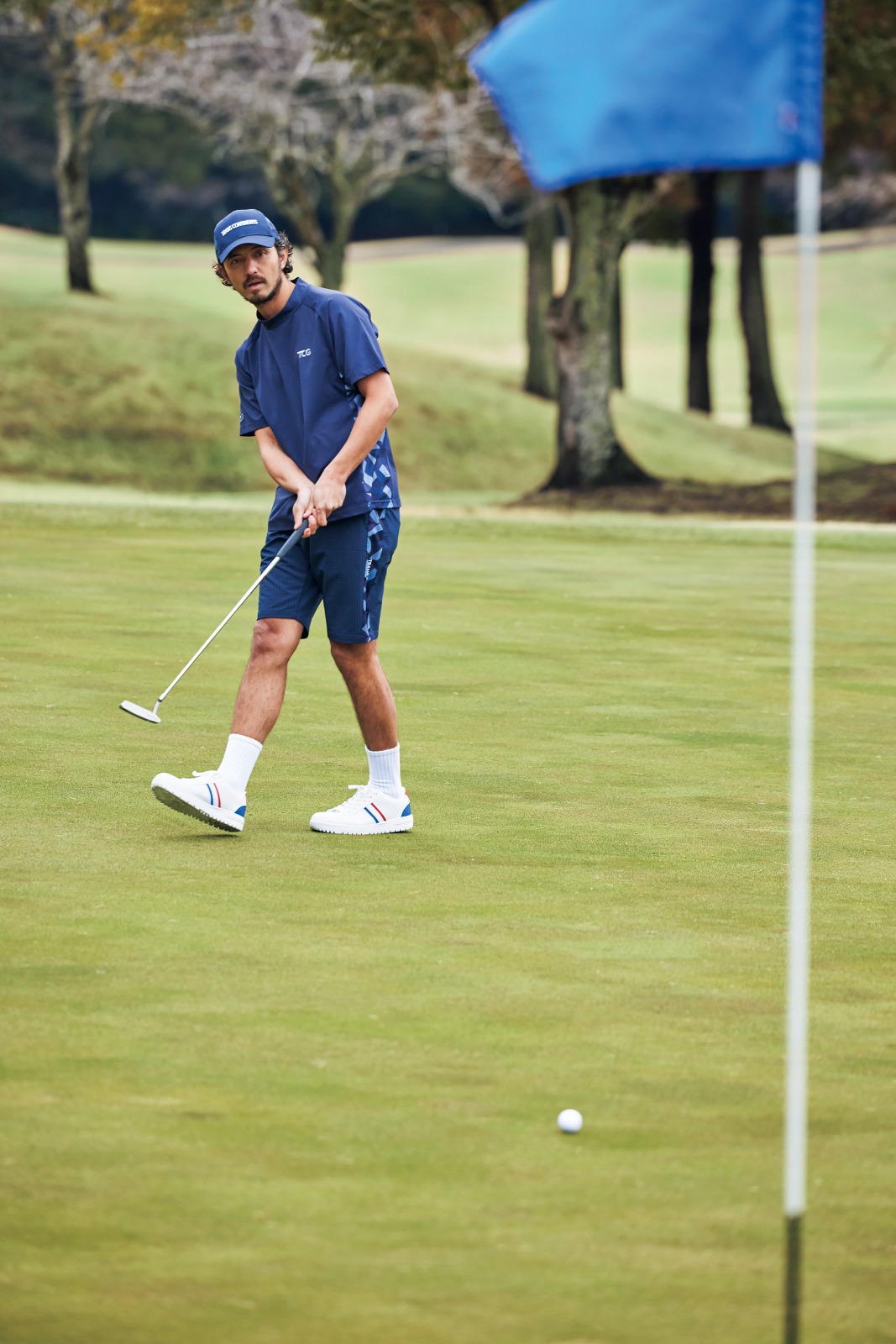 ネイビーのアイテムでシックにまとめたスタイリング。トリコロールカラーのシューズとホワイトソックスでスポーティ感もプラス。キャップ4,400円、モックネックシャツ6,000円、ショーツ7,000円、シューズ6,990円(すべてトランスコンチネンツ)、その他スタイリスト私物