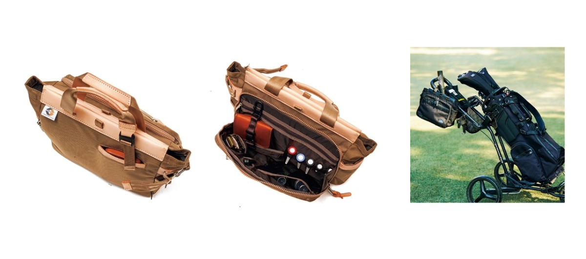 カートにも引っかけられる。ラウンドで活躍するコンパクトトート。AS2OVらしく収納箇所がたくさんある。フロントポケットにはスコアカードやペン、サングラスに日焼け止めからピンまで。すぐに取り出したいものをしまうのも◎。