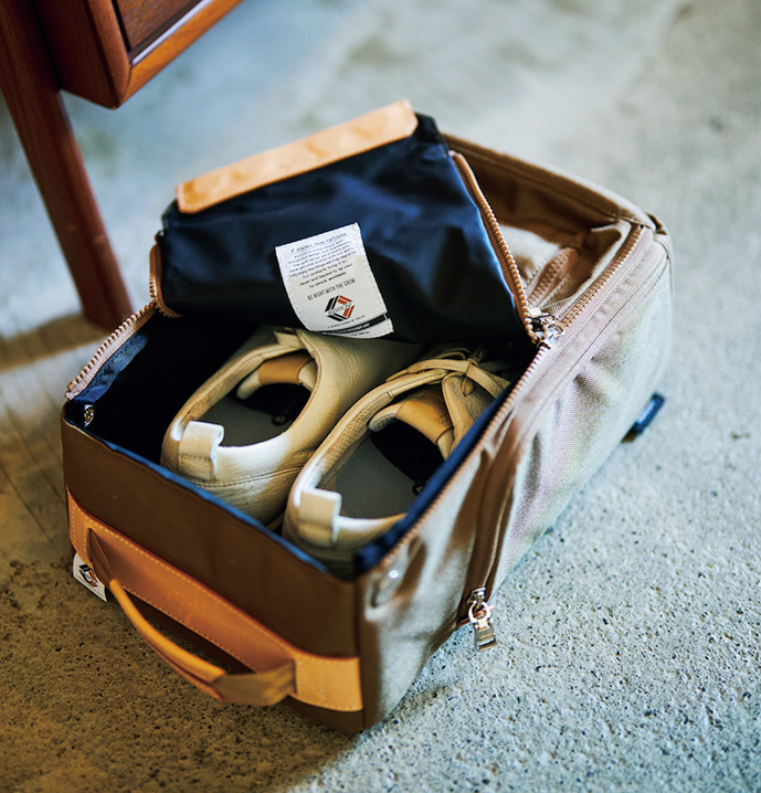 正面や側面にはポケットがあり、スパイク鋲などの細かなパーツはもちろん。普段から使用しているシューホーンやソックスなども収納する事ができる。内装にはPVC素材を使っているので、よごれてもお手入れは簡単。