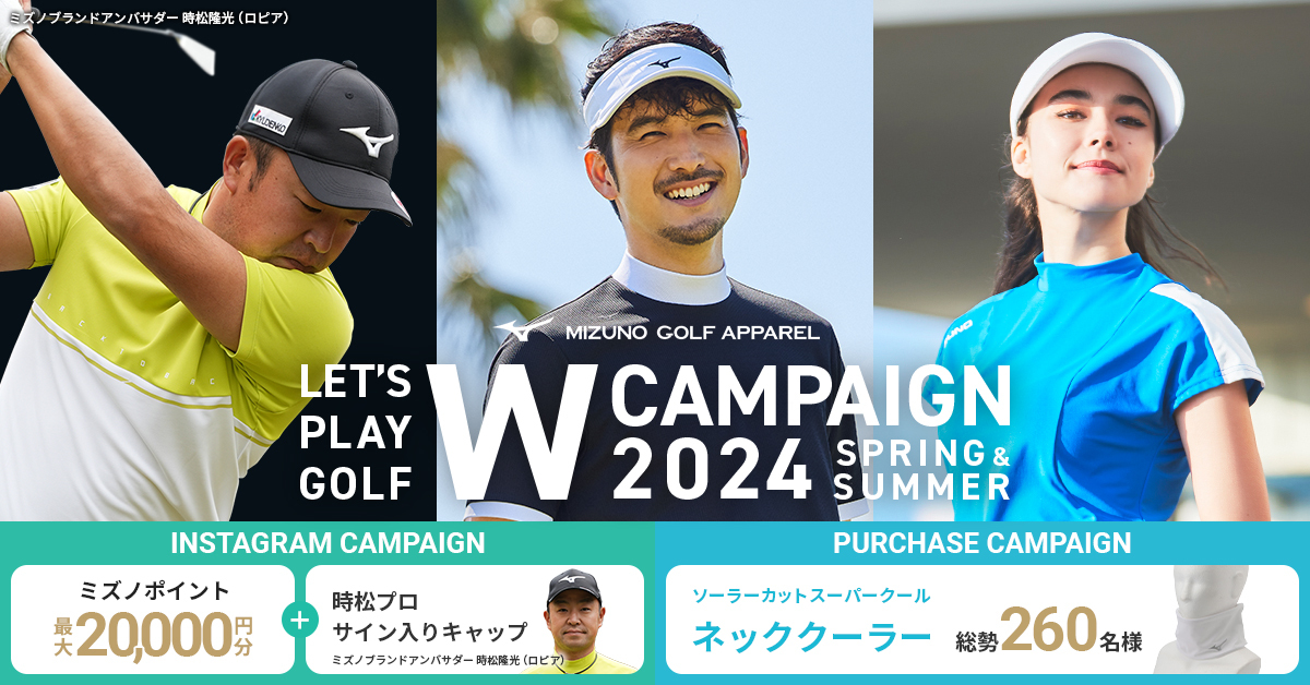 現在「ミズノゴルフ公式オンラインショップ」ではポイント、時松プロサイン入りアイテムのプレゼントなど、お得なWキャンペーンを実施している。夏のお買い物をさらにお得にするキャンペーンは、期間限定だからお見逃しなく!