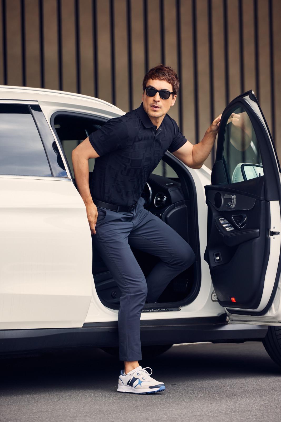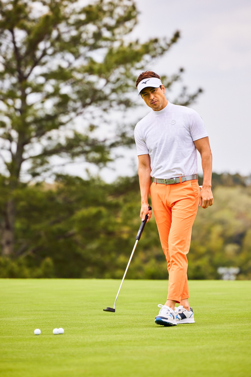 モデル着用商品 /驚2ストレッチロングパンツ ¥14,300、ポロシャツ¥13,200、バイザー¥2,530、ゴルフシューズ ¥17,600〔すべてミズノ〕