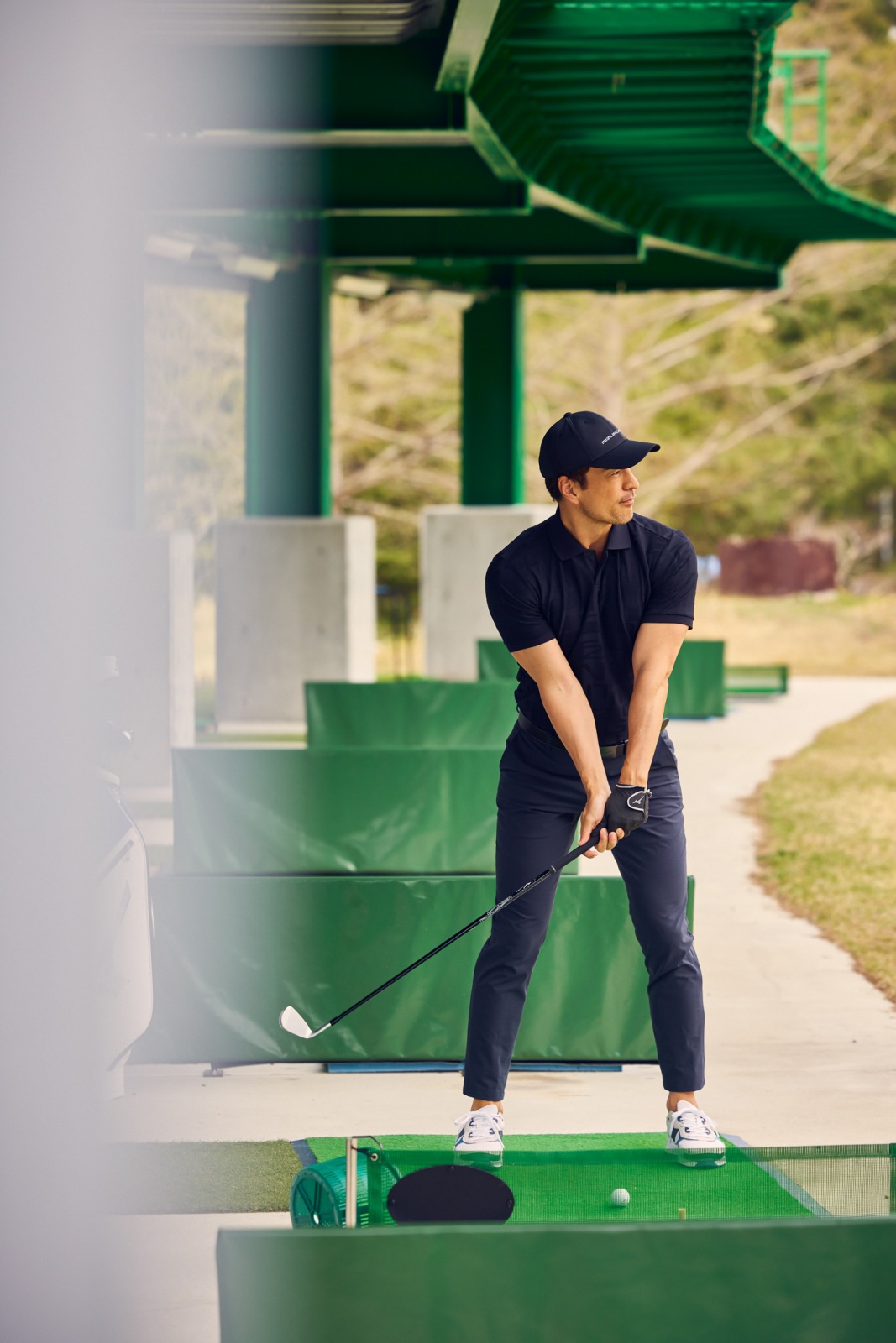 ラウンド前の練習場へ入れば、自然とスイッチが入るものだ。いつもスタイリッシュなアスリート感も醸し出せるのもミズノゴルフのウェアの魅力。ブラックの1トーンでのコーディネートに本気感もあるけど、トップスは無地に見えてジャガードで表現した、凹凸感のある個性的なロゴが目を引くなど、遊び心も忘れていない。これがまた紳士的な”デキる大人のゴルファー感”を纏うことができるのだ。