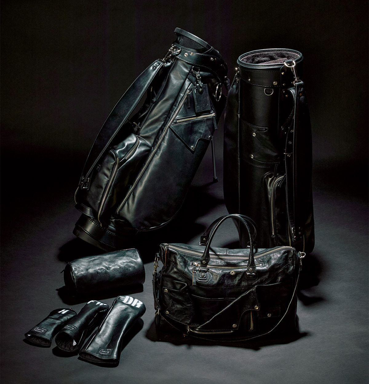 主素材に牛革を使用した圧倒的な重厚感が魅力のキャディバッグとボストンバッグには、ライダースジャケットの襟をモチーフとして配置。他アイテムもセット使いで世界観を楽しめる作りとなっている。シンプル&カジュアルが主流の中、一際存在感を示す武骨で男気溢れる漆黒アイテム。