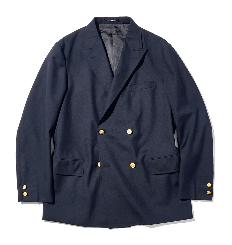 白眉なのはダブルブレストのネイビージャケットだ。アメリカントラッドの象徴的なアイテムをここで取り上げるとは、流石の審美眼。肌触りが良く高級感のあるJ.プレスの定番生地「ウールトロピカル」を使用し、背抜きをしているので軽量で通気性にも優れる。
