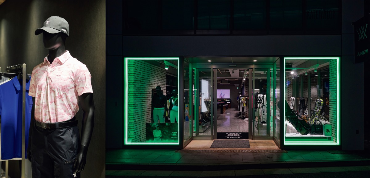 表参道の一本裏通りに佇む「ANEW GOLF」のフラッグシップショップ。世界中のゴルファーから支持される同ブランドは、日本の伝統的な桜カラーやモダンなネオンカラーが特徴。夜になるとグリーンのネオンサインが一層際立ち、明治神宮前駅と表参道駅からのアクセスも抜群です。海外からの観光客も多く訪れる、独特の存在感を放つこのショップ。