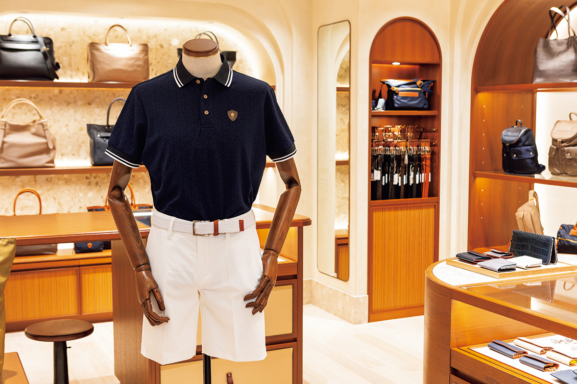 名門ゴルフクラブでのラウンドとの親和性の高い、レザーブランド「フェリージ」のゴルフライン。素材や作りにこだわり、上質に仕立てられたそれは着心地も極上。紳士淑女のワードローブに、ナイロンバッグや革小物を合わせると、より一層洗練された印象に。この時期、トルソーが着るポロシャツとショーツの合わせを選べば、爽やかな風をターフに運んでくれることだろう。