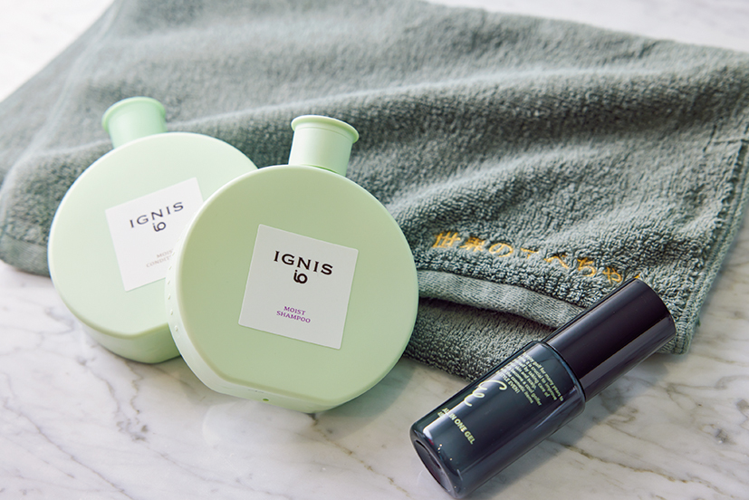イグニスのシャンプー&コンディショナー、EVENオリジナルのオールインワンジェル。ポーチ内は他にスキンオイル、ヘアブラシなど。