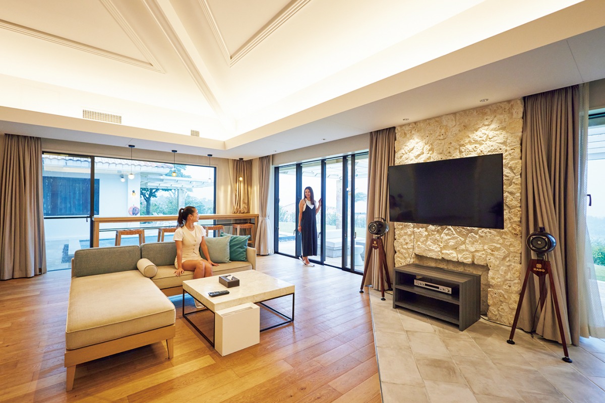 そんな「かねひで喜瀬CC」は多彩な宿泊施設を備えており、中でもゴルフ場の敷地内に点在するコテージは優雅な時間を過ごせると評判だ。今回紹介するのは2022年8月にグランドオープンしたプレミアムコテージで、開放的なリビングルーム、2つのベッドルームとバスルーム、そしてプール付きのプライベートガーデンなどを備え、最大8名まで宿泊できる。