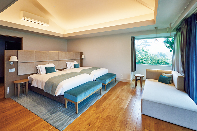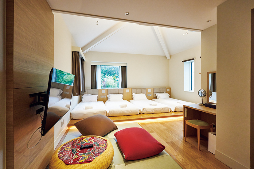 多人数でよりゴージャスなリゾートステイを満喫したいなら、200㎡超の広さを誇る「スイートコテージJINWA」を利用したい。広々としたリビングルーム、プライベートガーデンに加え、4人用を含めた3つのベッドルームを備えており、最大9名がゆったりと宿泊できる。
