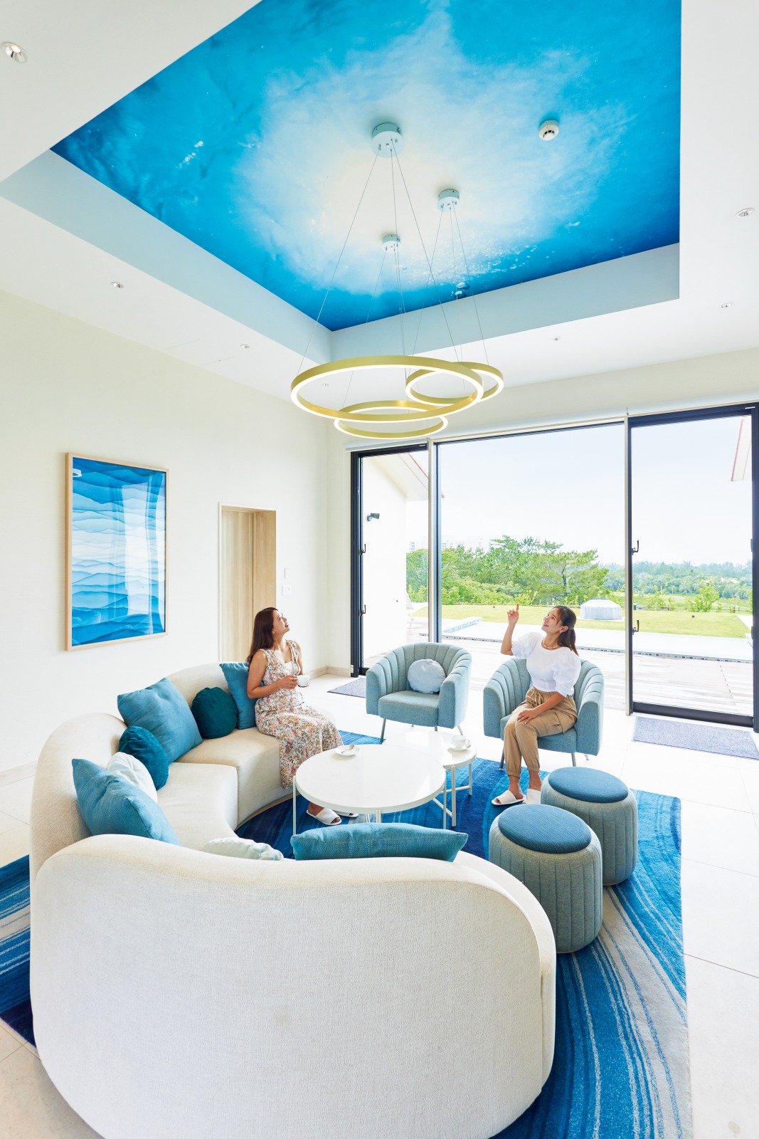 玄関を入るとリビングルームが広がり、その左右にベッドルームを配した間取りだ。海と空をイメージした内装&インテリアが落ち着いた雰囲気を演出している。