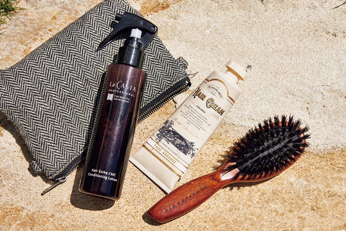 ブローやスタイリング時に必須のブラシとヘアクリーム。ブラシはシャンプー前にも使って髪のもつれをとり、毛穴の汚れを浮きやすくする。シャンプーの泡立ちも良くなるし、頭皮マッサージ効果も期待できる。