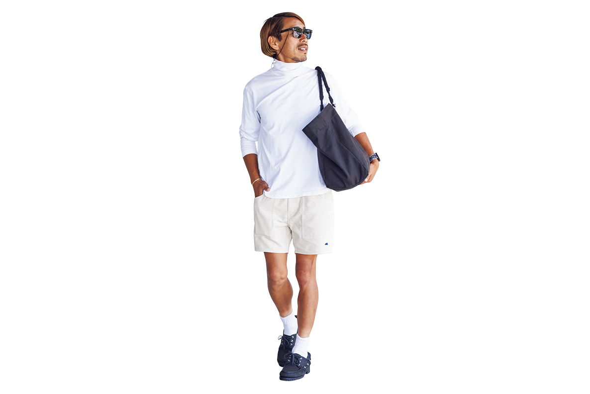 ソックス、サングラス、時計など、ちょっとしたところでブラックを差し込んでいるから、ホワイトをベースにしたモノトーンな涼感も楽しめる。パステル系の色を差し色にすれば、彩りも夏ならでは。素材感、シルエット、サイズ感で着こなしの表情も変わってくるのでオススメのアレンジです。
