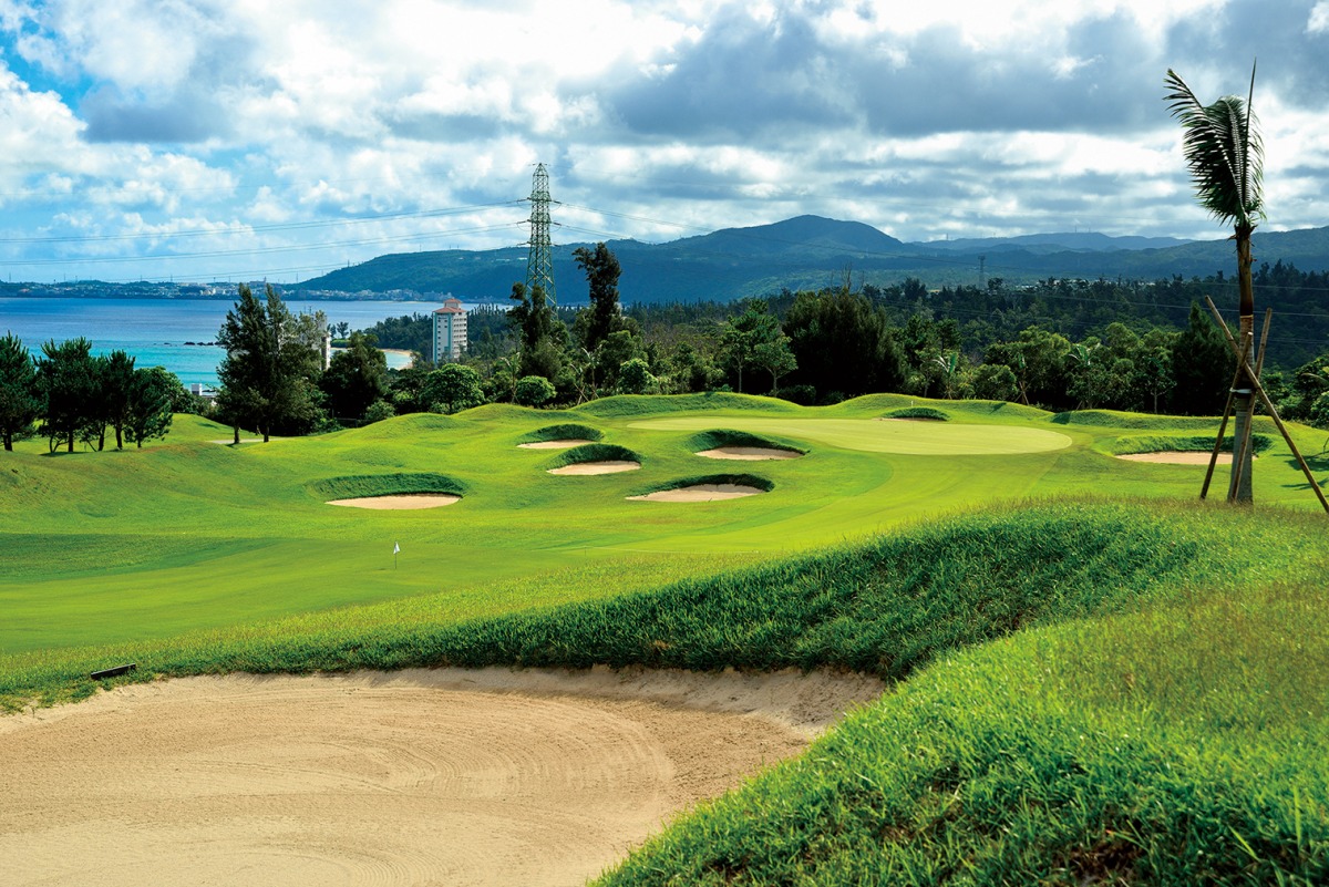 戦略的に設計された美しいコースで、その素晴らしい景観と挑戦的なレイアウトが特徴です。山の自然を生かした「YAMBARU」と海を感じる「UMIKAJI」で異なる雰囲気を楽しめます。攻略のポイントは、ショートホールは難易度が高くパーを守る技術が求められ、一方のロングホールは攻めることでバーディチャンスが訪れます。グリーンにシーショアパスパラムという、耐塩性の強い日本では珍しい種類の芝を使用していることも特徴です。