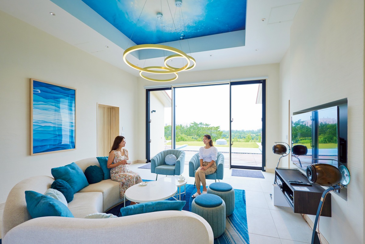 今回紹介するのは2022年8月にグランドオープンしたプレミアムコテージで、開放的なリビングルームに2つのベッドルームとバスルーム、さらにプール付きのプライベートガーデンなどを備え、最大8名まで宿泊可能。ガーデンテラスでは、ゴルフ場の景色を眺めながらバーベキューを楽しむこともできる。