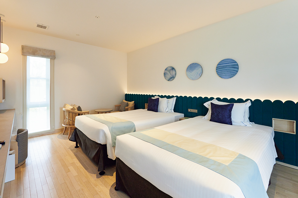 200㎡超の広さを誇る「スイートコテージJINWA」なら、よりゴージャスなリゾートステイを満喫できる。広々としたリビング、プライベートガーデンに加え、4人用を含めた3つのベッドルームで9名まで宿泊できる。