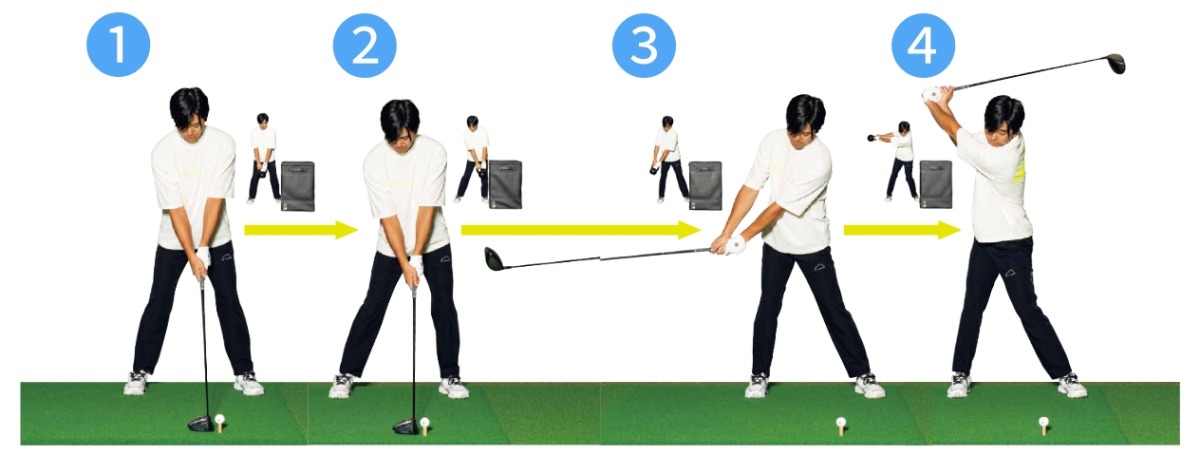 ④ いったん横に動いてから、体を回し、クラブを上げていく。これらがシームレスに行われることが理想的なバックスイングだ。