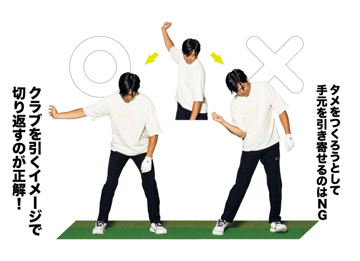 切り返しでタメを作ろうとして手元を引き寄せる動きをすると、スイングアークが小さくなってヘッドが加速しない。むしろ、手元を遠ざけるようにクラブを引くイメージで切り返すと、スイングアークが大きくなって飛距離アップにつながる。