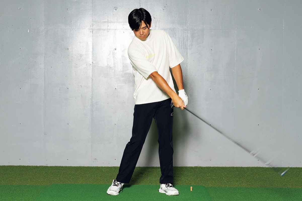 しっかりと左足を踏み込みながらインパクトを迎えることでヘッドスピードが最大化する。どうしても右足に体重が残ってしまう人は、右足をつま先立ちして、左足1本で立って打つドリルに取り組もう。