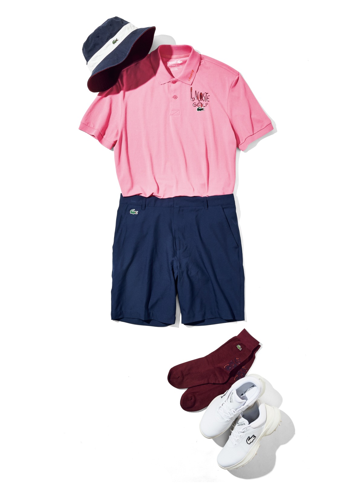 目に飛び込むピンクを主役に、遊び心感じる大人の可愛さを堪能。胸元に手書きペイント風のアクセントを配したポロシャツが、端正なショーツを旬顔へとシフト。バケハを選ぶことで、いまどき感とストリートな要素を、さりげなく。