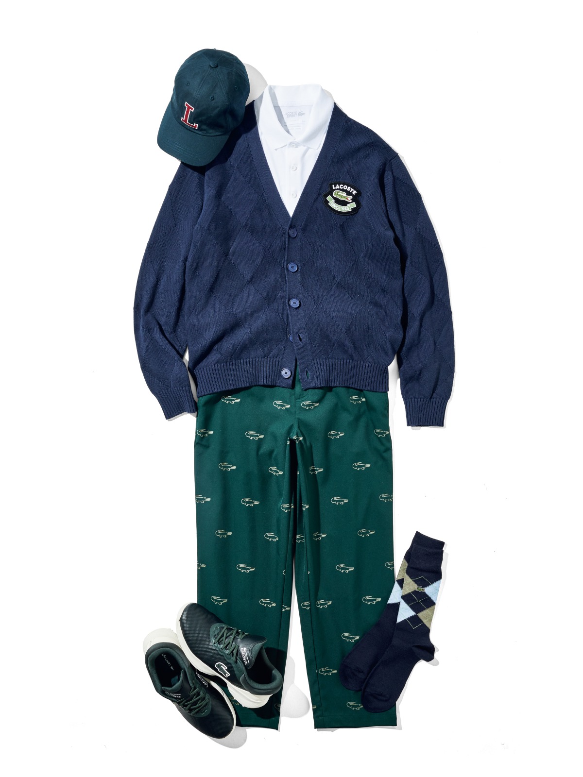 アイコンであるワニ総柄のパンツと、アーガイル柄インターシャのざっくりニットカーデで作る、トラッドなコンビ。落ち着いたネイビー&グリーンの配色が、高感度を引き立てる。名門のゴルフ場にもタウンユースにもマッチする、高感度なプレッピースタイル。
