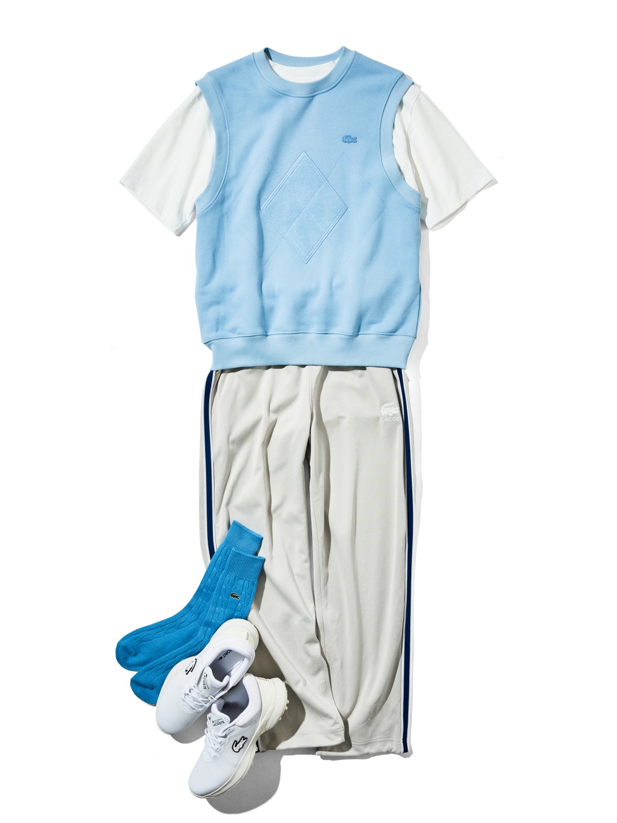 涼しげで爽やかな雰囲気を漂わせるライトブルーのスウェットベストには、アーガイル柄を採用。トレンドのストリートっぽさを取り入れたサイドライン入りジャージーパンツが、秋のゴルフシーンで気分を高揚させる。鮮やかな色使いがコースで映える。