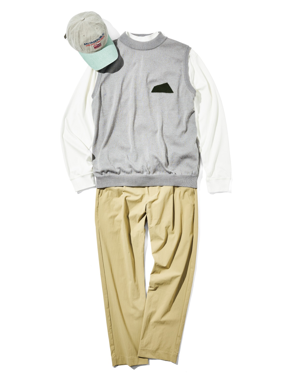 ポロシャツやモックネックとの相性を考慮されたセミモックネックベストを重ねると、パンツコーデに奥行きとこなれ感を出す。リサイクルポリエステルを使用し、環境への配慮も◎。左胸のダイアモンドヘッドロゴがアイコンとして存在感を発揮。キャップ5,940円、ベスト24,200円、ロングスリーブポロシャツ19,800円、パンツ26,400円