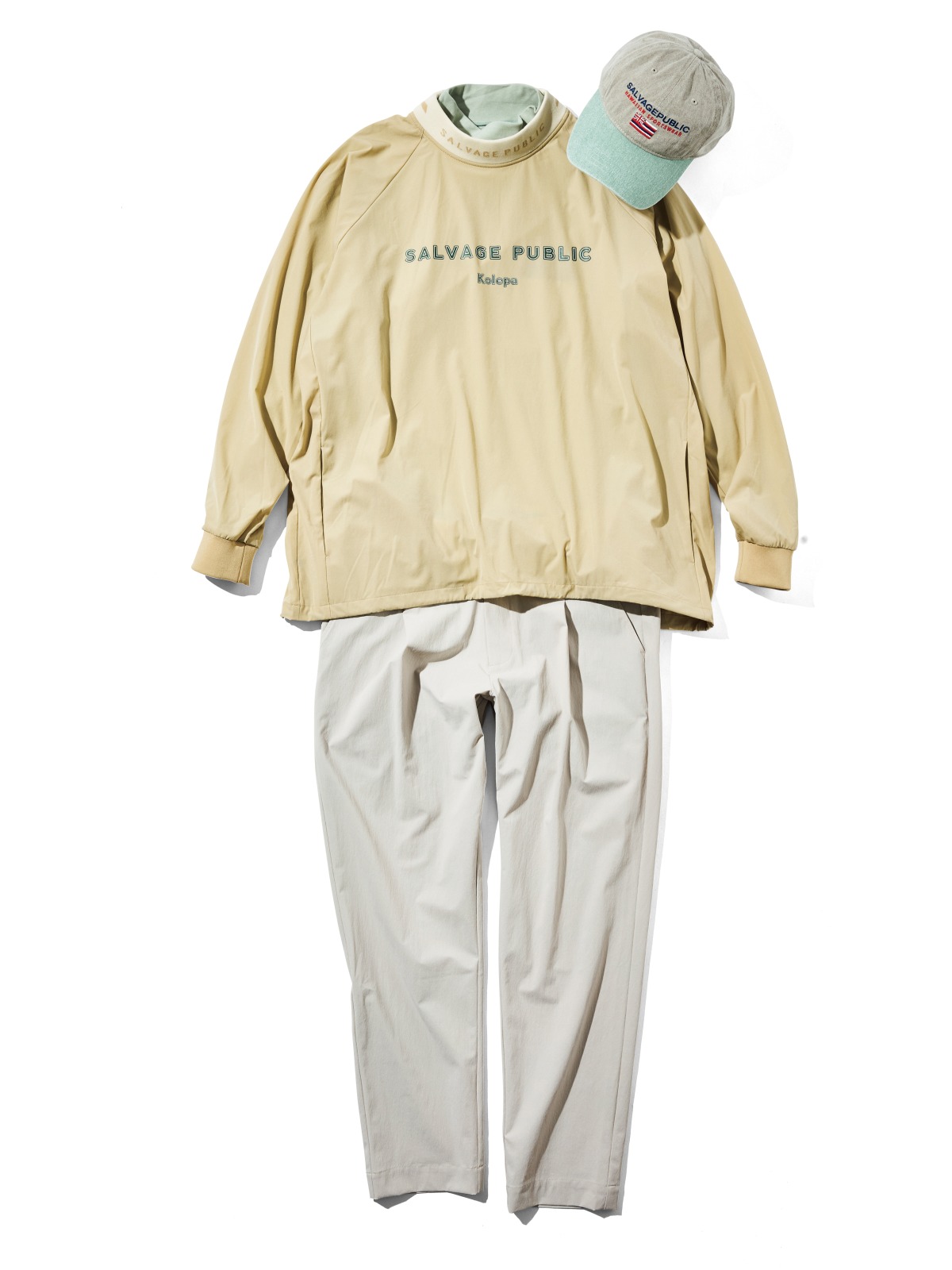 そうして生まれた「SALVAGE PUBLIC Kolepa」。コンセプトは、ブランドのイメージはそのままにゴルファー目線のアイテムづくりである。それゆえに生地、付属金物、ポケットの配置や形状等々、あらゆるポイントで徹頭徹尾議論を重ね、一点一点拘り抜いて商品化されているのである。とはいえそんなロジカルなものづくりながら、リラックス感溢れるアイテムばかりというのが、このブランドの最大のキモである。