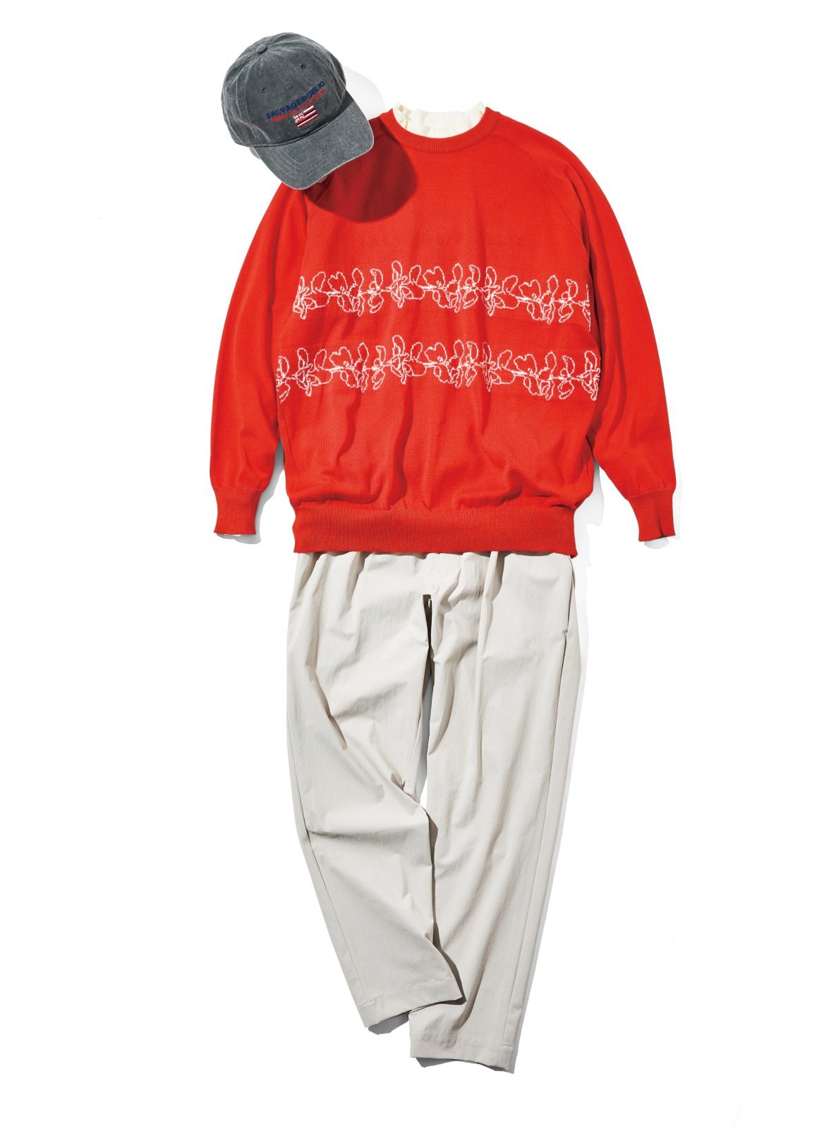 サンセットをイメージしたニットで秋コーデを一新。フロント&バックにはリゾート感溢れるダブルレイ柄をジャガード。定番人気の1タックトラウザーズは、股下を+3cmアップデート。テーパードシルエットと4WAYストレッチが、スコアメイクに欠かせない。キャップ5,940円、ニット26,400円、モックネックシャツ16,500円、パンツ26,400円