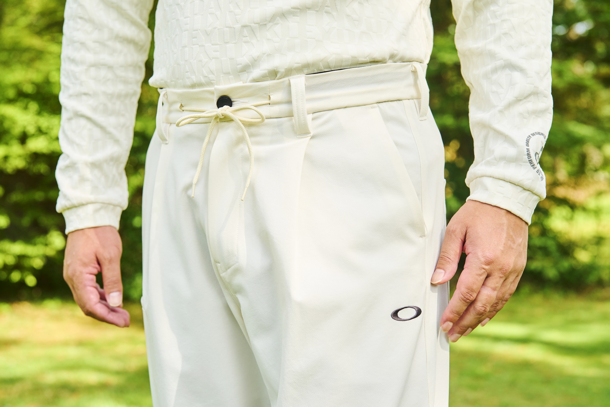 今季オークリーのゴルフウェアを象徴するようなスタイリングのこちら。何よりも目を引くのがオフホワイトのワントーンカラーだろう。ポイントとなるのは淡い色合わせ。街着でもツアープロでも洒落モノたちが取り入れるコーディネートだ。