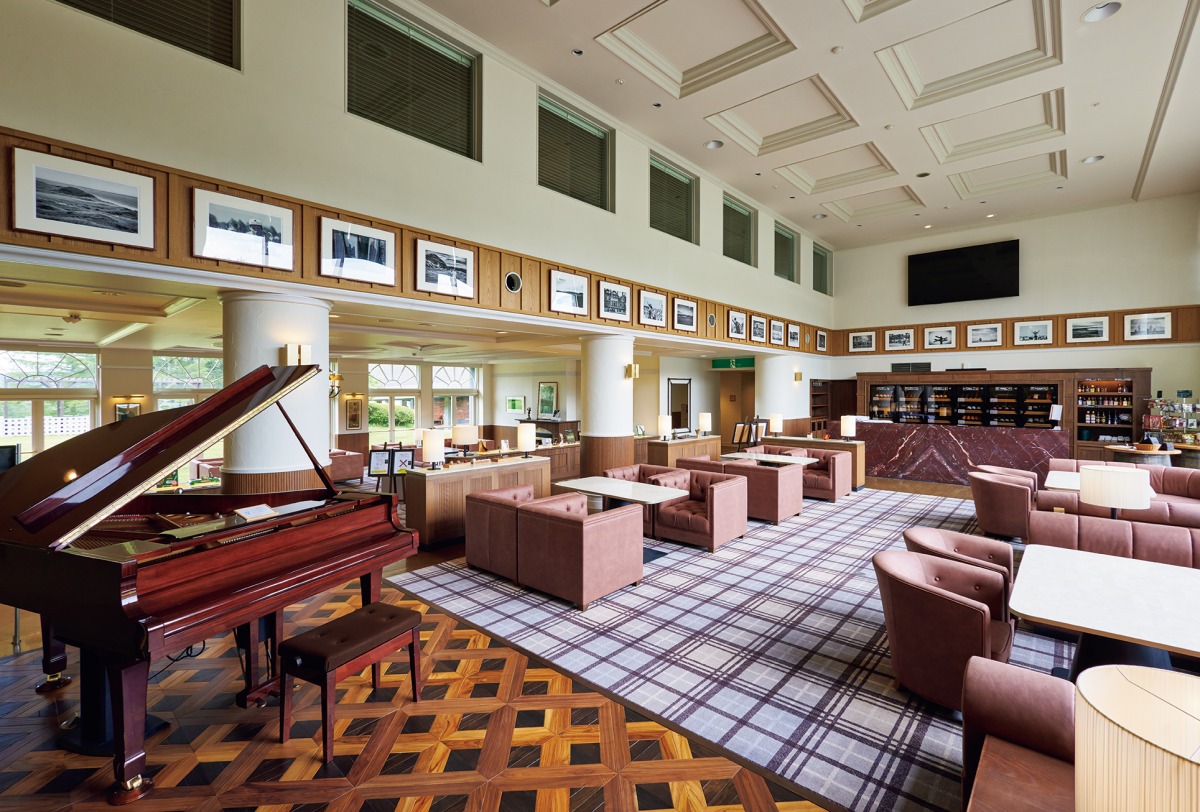 ラウンジのコース側のエリアは、明るさを抑えた照明にマントルピース、国内外から集めたゴルフ関連の書籍が並ぶライブラリーコーナーなどがあり、静かで落ち着ける雰囲気だ。