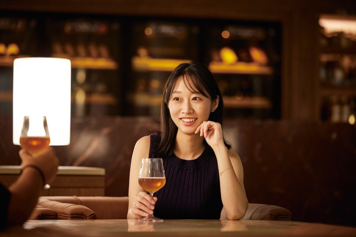 ラウンジの吹き抜けエリアにはピアノやバーカウンター、EURO CAVE製のワインセラーなどが設置されている。カウンターには、ワインやウイスキー、ビール、焼酎、ソフトドリンク、スナック類が常備されている。