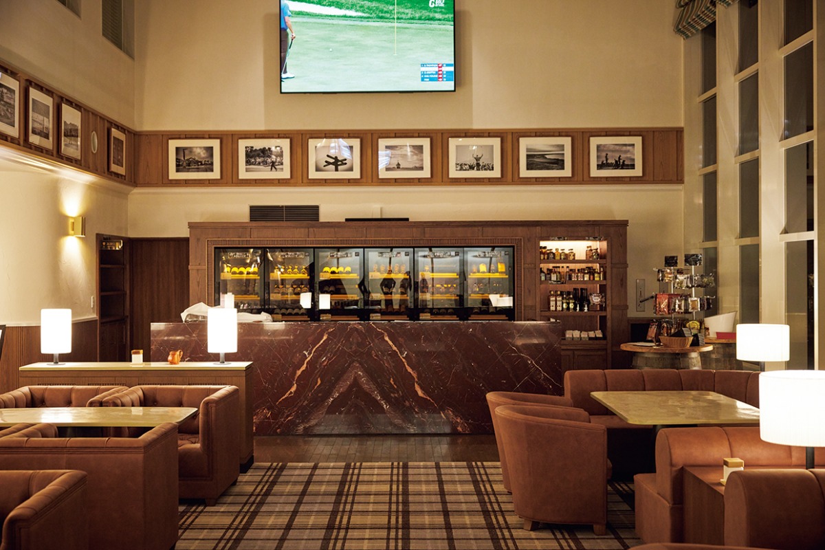 ダイニング棟へと向かう通路を挟んだ両側のエリアに、バーラウンジ「イフス・アンド・バッツ」が誕生した。大きな窓からコースを望むエリアには、国内外から集めたゴルフ関連書籍のライブラリーコーナーが設置され、落ち着いた空間が広がっている。一方、駐車場側のエリアにはピアノやバーカウンターが設置され、カジュアルながらもゴージャスな雰囲気が漂う。EURO CAVE製のワインセラーが設置され、多彩なドリンクメニューとスナック類が常備されており、セルフオーダー方式で利用できる。