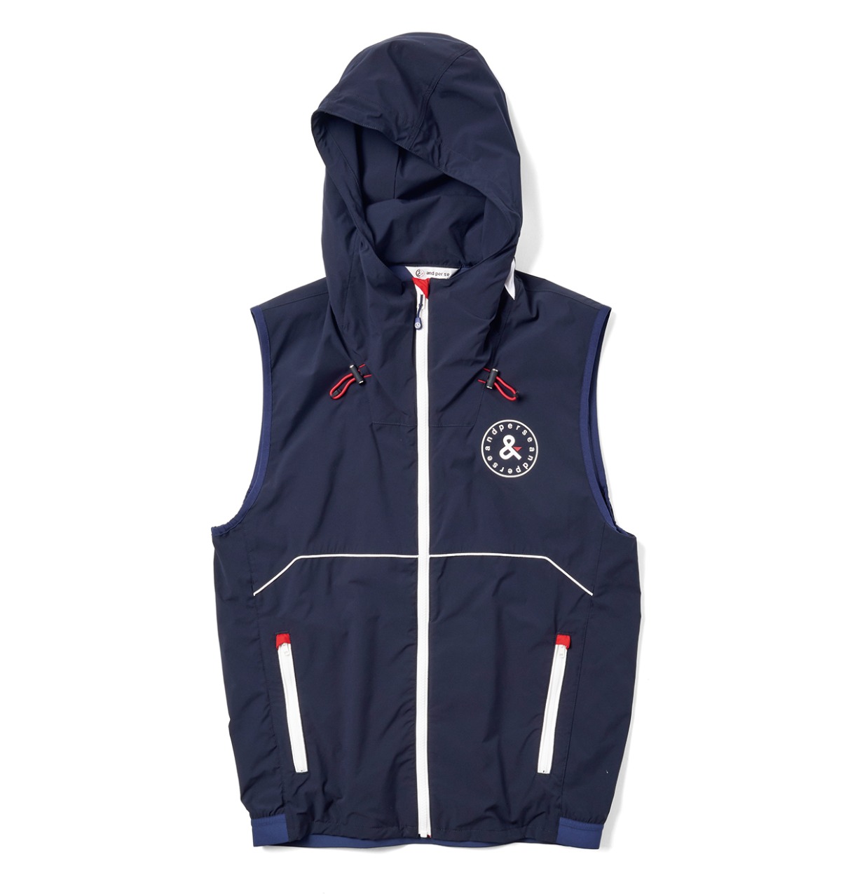 エアジャスターのフーディーベスト。袖防風のハイネックセーターと組み合わせれば、冬まで着用OK。フーディベスト17,600円