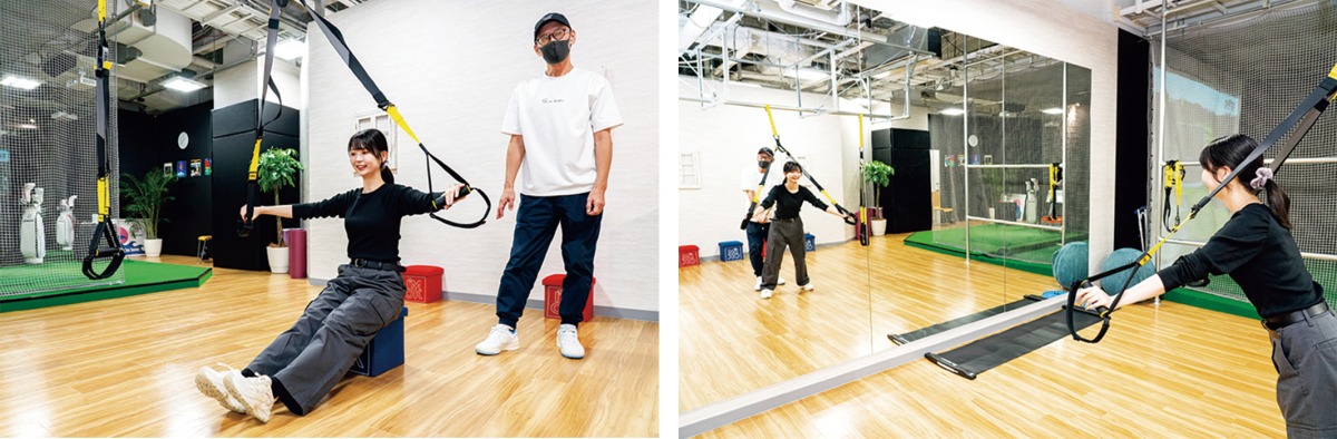 女性限定のスタジオではあるがアメリカや韓国でも話題のTRXサスペンションを取り入れていた先進的なゴルフのトレーニングに興味があった。TRXエクササイズは米海軍特殊部隊が考案したと言われ、自重で全身トレーニングができる。ここでは専門のトレーナーのサポートのもとで、ゆっくりと筋肉に教えていきながら柔軟性、体幹力の強化に期待ができるし、バランス力のアップはラウンド時の様々なアンジュレーションでのショットの精度アップに効果あると思う。