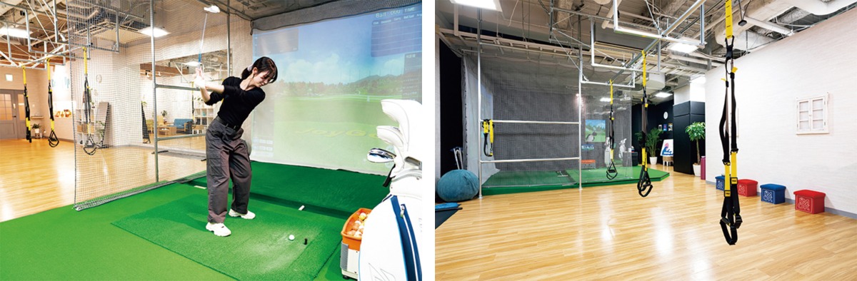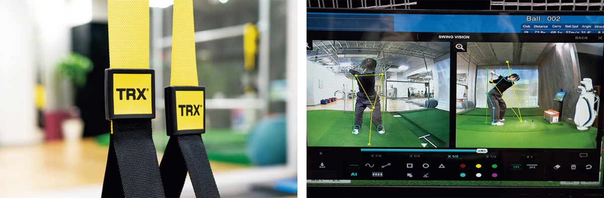 スタジオ内は「TRXトレーニング」用に4つのサスペンションが設置されていて、体が覚えたフォームの練習をすぐ実践できるようにシミュレーションエリアも2打席完備。カフェのように明るく開放的な空間は効率的で効果的な練習に最適。TRXを取り入れた新しいアプローチの練習方法で理想のスイングメイクを追求できる。