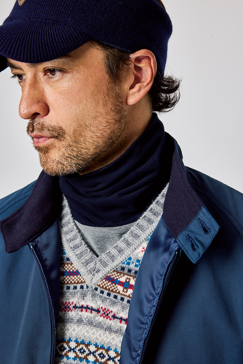 暖かみのあるフェアアイルニットにハイネックが映えるのも、スウィングトップの特徴だろう。街ではトラウザーズやローファーを合わせれば、ノーブルな印象にもなる。37,400円(アリガインターナショナル)