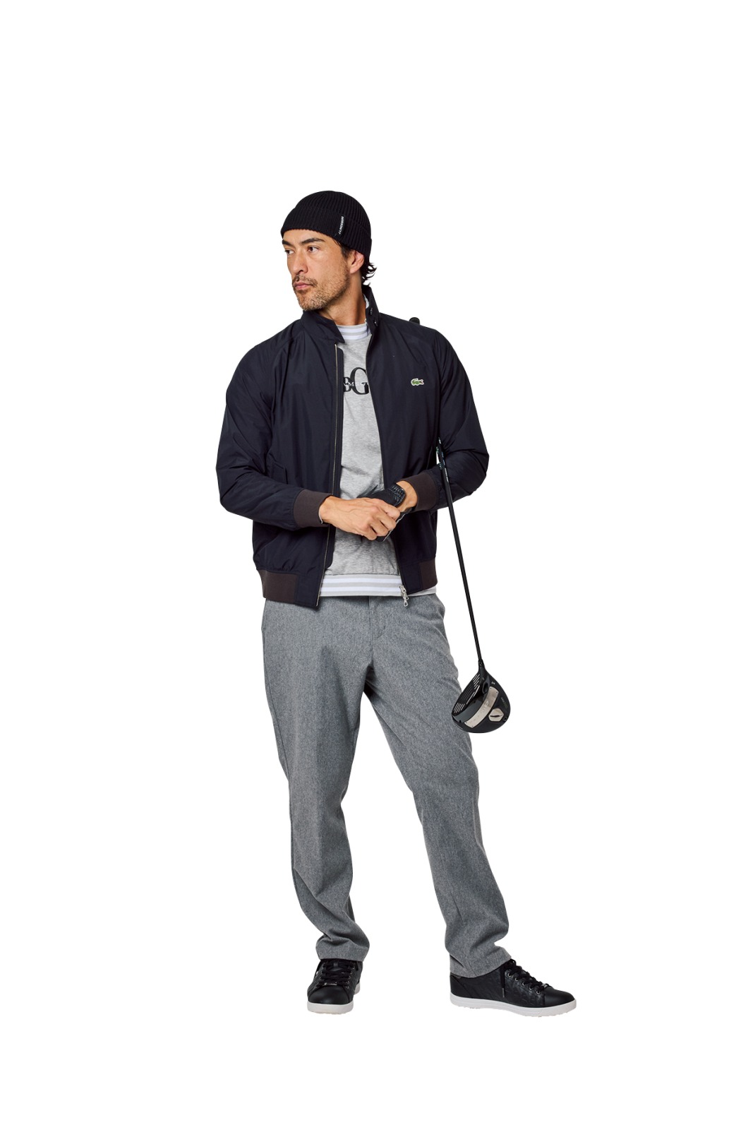 馴染みが良く感じるのは、スウィングトップのインナーとパンツを黒とグレーに絞ったレイヤードにしているから。異素材によるメリハリを加えることで、こなれた雰囲気がさらに漂ってくる。30,800円(ラコステお客様センター)