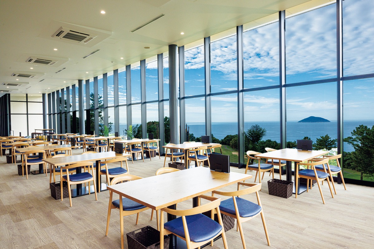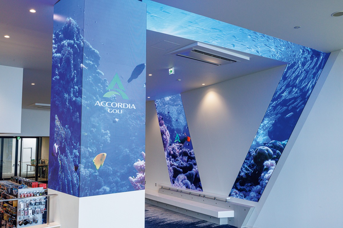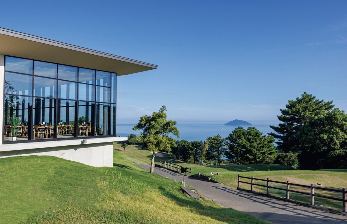 開場50周年を迎えた二丈カントリークラブのクラブハウスが、利便性やエンターテインメント性を重視し、プレー以外でも楽しく快適に過ごせる平屋造りのクラブハウスに生まれ変わった。LEDビジョンやプロジェクションマッピングによる波の演出はこれまでにない新しい試み。レストランからの眺望も素晴らしい。