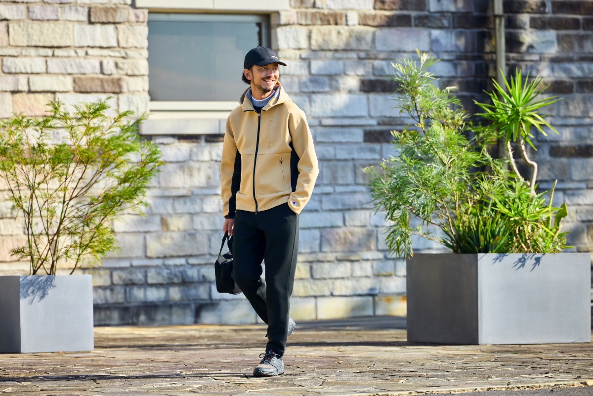 ナチュラルカラーのベージュにブラックをアクセントカラーにした配色はスポーティでいて、どこか上品。胸元のエンボスロゴもさりげない。同素材のパンツと合わせたセットアップは、セットアップの着こなしに気恥ずかしさを感じる御仁にもおすすめできる好ペアリングだ。