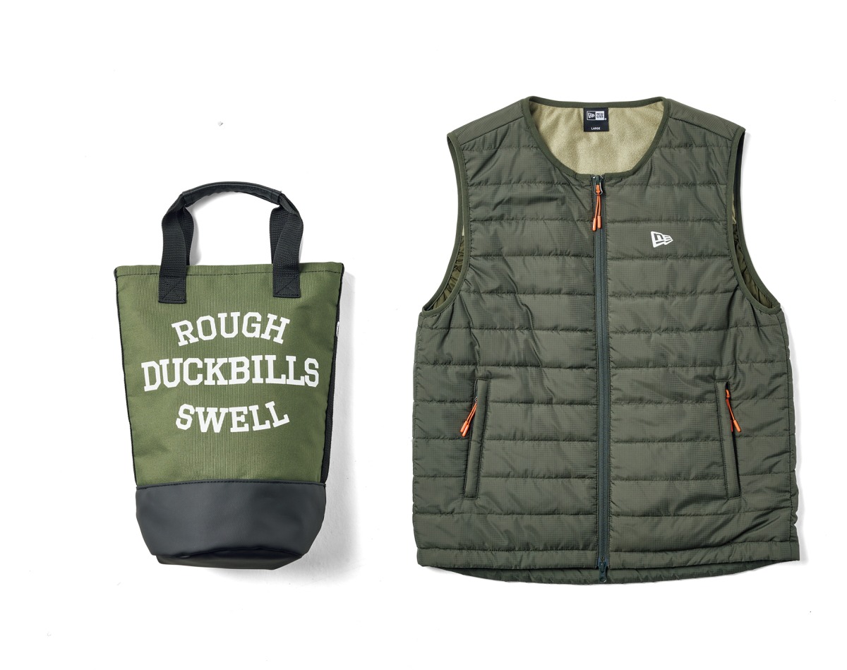 ナチュラルで落ち着きも感じられ、悪目立ちしないアースカラーは、来年以降もゴルフアパレルにおけるトレンドカラーだろう。ベスト13,200円(New Era® 問:ニューエラ)、シューズバッグ6,600円(ラフ&スウェル 問:フーリッシュ)