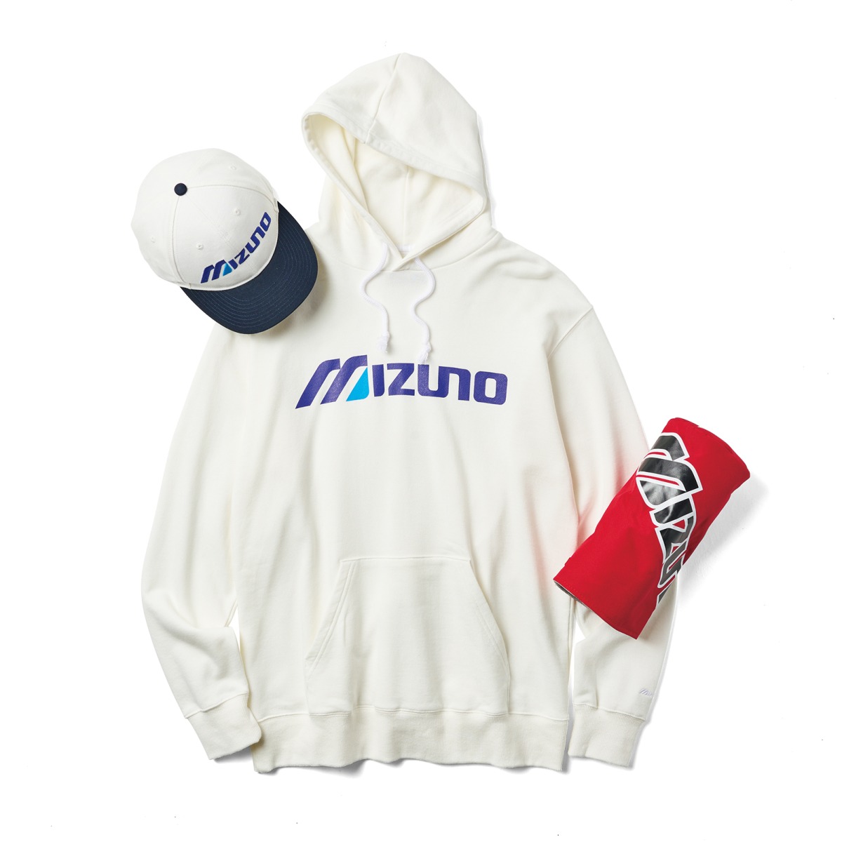 日本を代表するスポーツメーカー「ミズノ」のクラシックロゴの格好良さをシンプルに表現した「ニューヴィンテージゴルフ」の好コラボは、彼らの出世作となった。キャップ7,700円、フーディー19,800円、ヘッドカバー8,800円 問:NEW VINTAGE GOLF