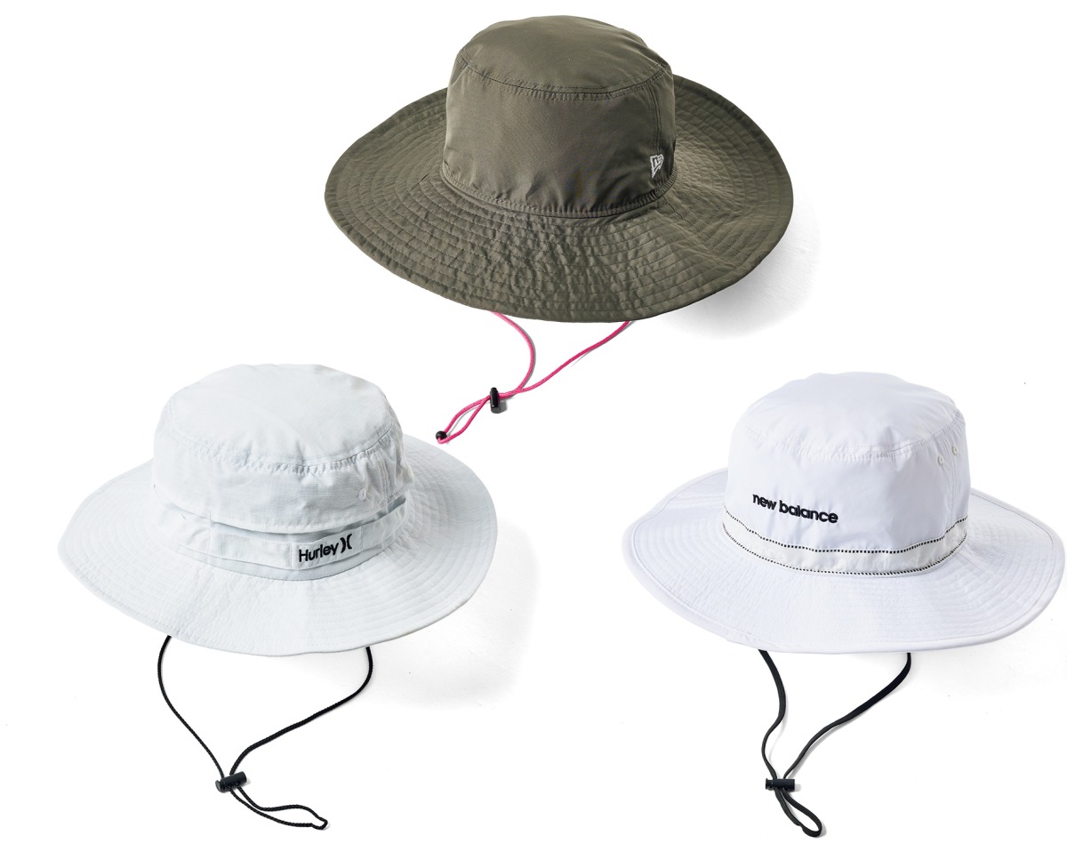 PGAツアーや国内男子ツアーでもちらほら見掛けるようになったサファリハット。右から6,600円(Hurley 問:Hurley)、6,930円(ニューバランス ゴルフ 問:TSI ニューバランスゴルフ セクション)、5,500円(ニューエラ 問:ニューエラ)