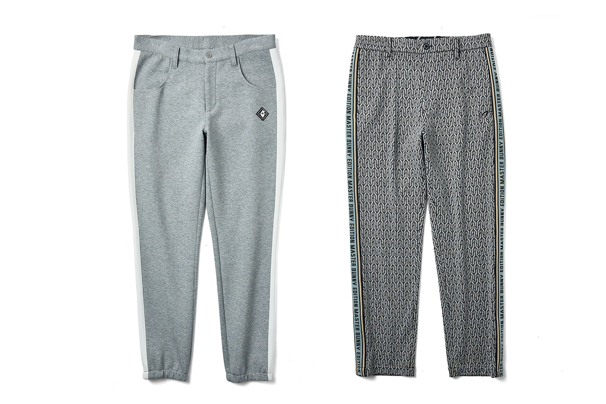 流行りのファッションアイテムとして、メンズ・レディス共に目立ったサイドライン入りのパンツは、来季以降ゴルフウェアにも増えるかも。37,400円(MASTER BUNNY EDITION 問:マスターバニーエディション)、27,500円(V12 問:V12カスタマーセンター)
