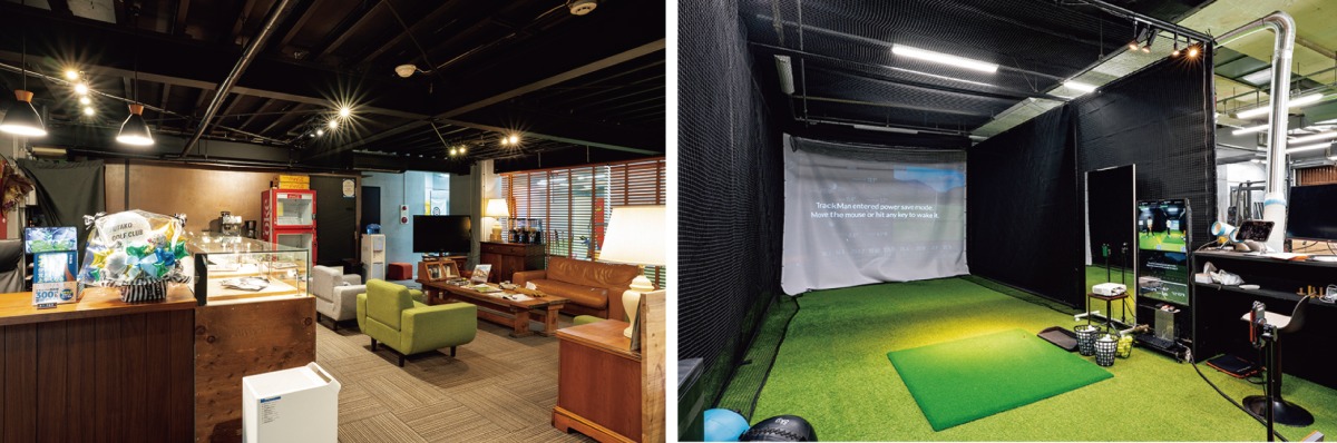 ゆっくりとくつろげるリビングスペースは、ゴルファー同士の交流の場となっている。個室には「トラックマン」や「ゴルフビジョン」といった最新の計測機器も完備している。