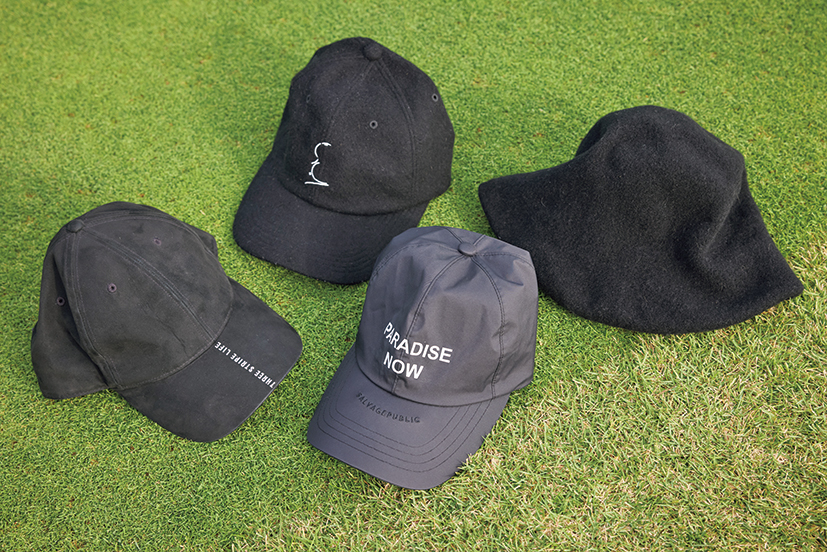 左からスッキリしたブラックコーデが整うスエード素材、今回着用のフランネル素材のキャップ、ご機嫌なメッセージのレインキャップと装いのシルエットに違いが出るフランネル素材のバケハ。