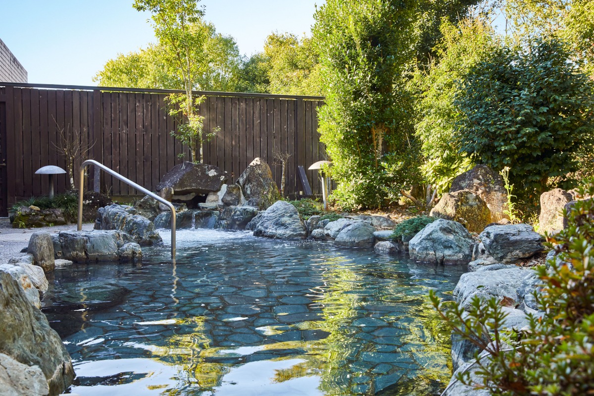 ゆったりと利用できる宿泊者限定施設の天然温泉スパでは、落ち着いた雰囲気の内湯と趣のある露天風呂を堪能できる。